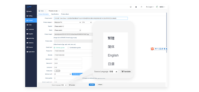 前后台支持中文简体、繁体、日语、英语等多种语言的自由切换,同时支持多语言定制,支持商品名称、规格、分类等数据字段多语言维护
